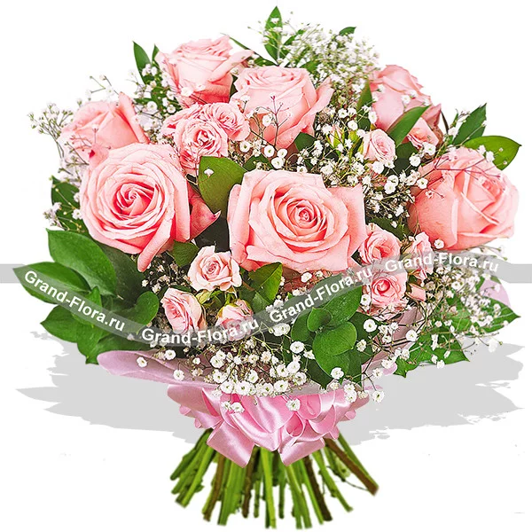 ДЕЛЮКС: роза розовая - 15 шт., роза кустовая розовая - 10 шт., гипсофила - 6 шт., рускус, фетр розовый, бант розовый. Примерный диаметр букета 50х50 см.