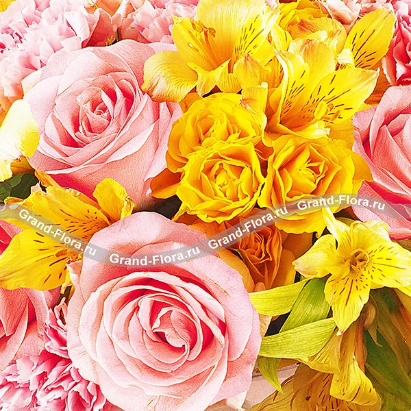 Кустовые жёлтые и розовые розы - Тепло романтики