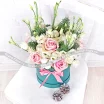 Стандартный: роза розовая - 7 шт., эустома белая - 6 шт., хлопок - 4 шт., ель, мини шарики - 4 шт., оазис, коробка, лента.